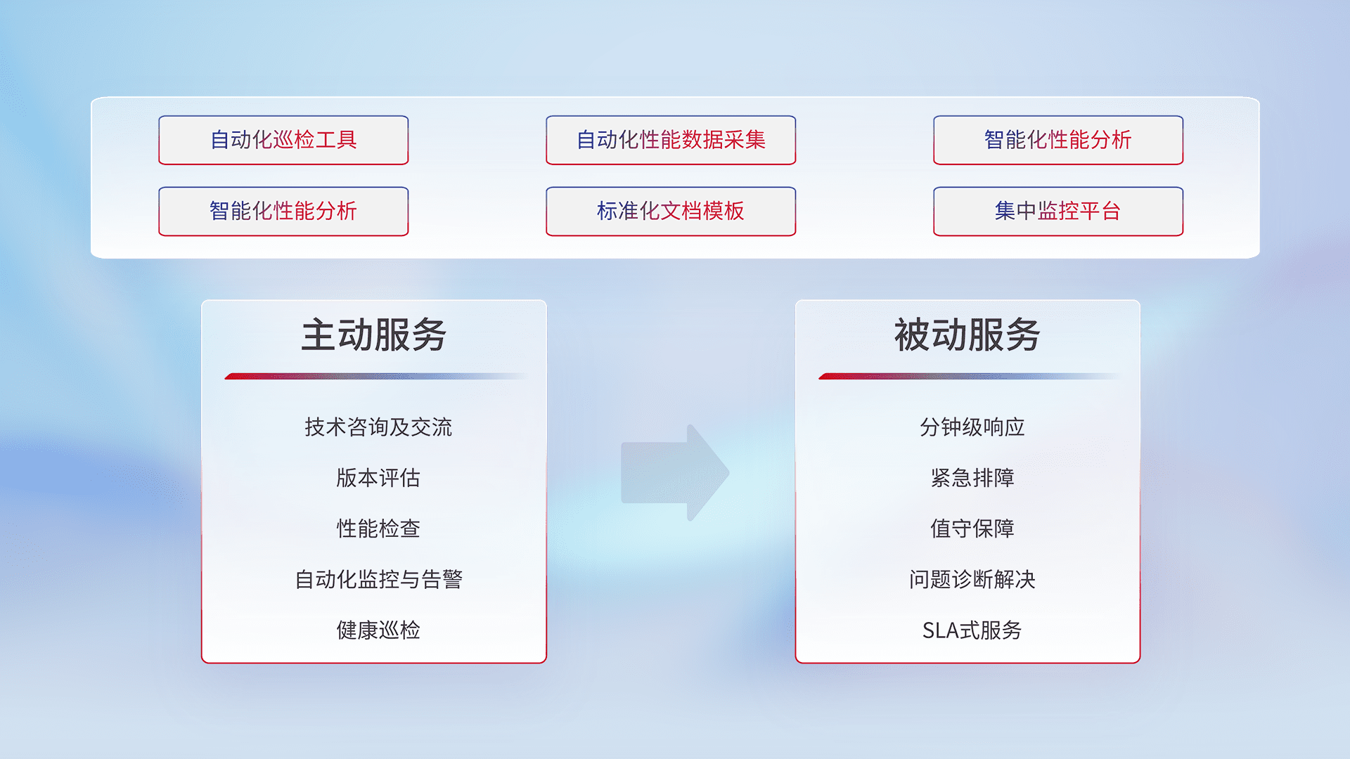 智能化工具和标准化文档,,保障服务质量,,,提供主动服务(包含技术咨询、、、版本评估、、、性能检查、、自动化监控与告警、、、、健康巡检)和被动服务包含(分钟级响应、、紧急排障、、、值守保障、、问题诊断解决、、、、SLA服务)。。。。