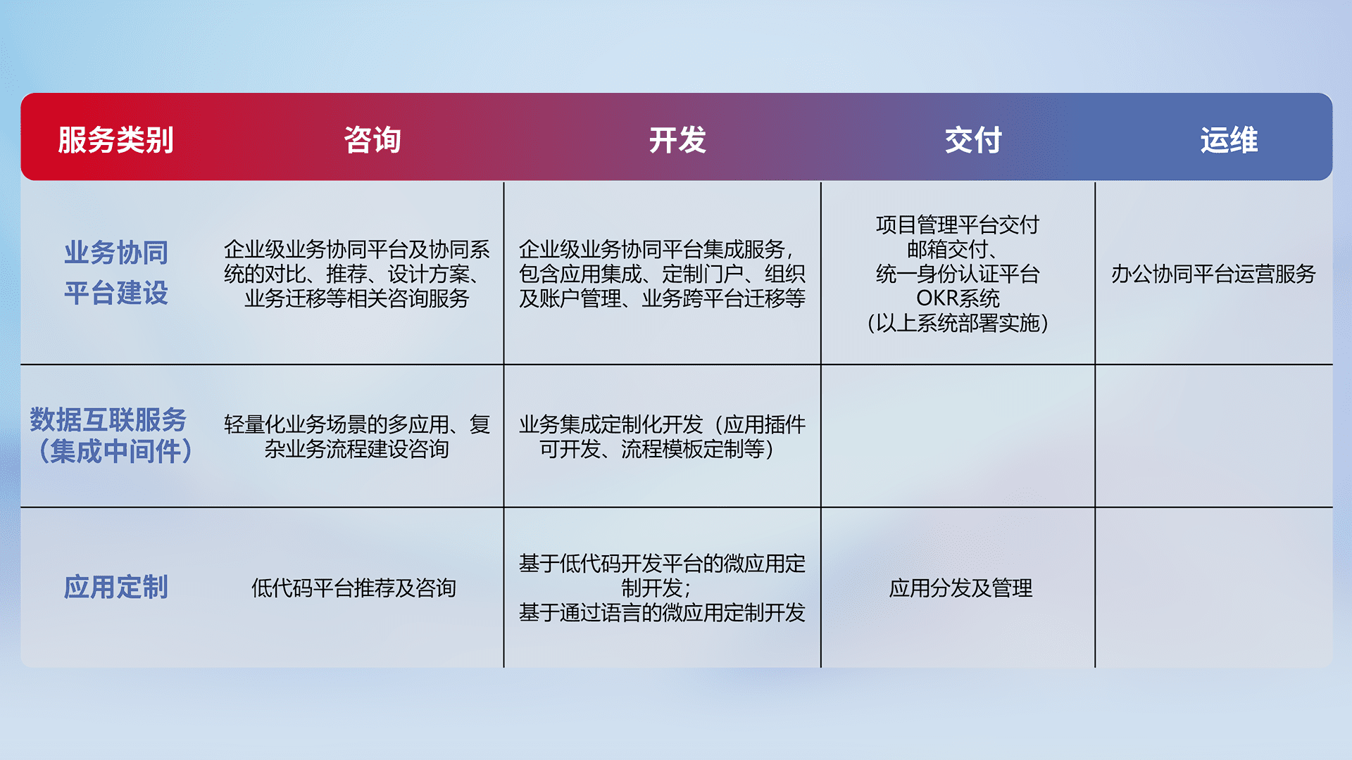 针对钉钉、、、企微、、、、IDaas等平台级产品提供产品的规划、、、、方案、、交付、、、定制化开发等服务,,实现如统一协同办公、、、智能客户服务、、、混合会议管理、、、智能数据查询、、、、等业务场景,,,,实现数字化转型。。。